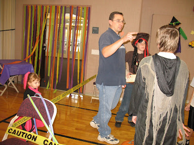 Aubrey is a little afraid of witches. So daddy had to hold her to pin the nose on the witch. It's funny that she's not afraid of daddy's skulls & monsters (well most of the time) but she is afraid of witches, go figure!
